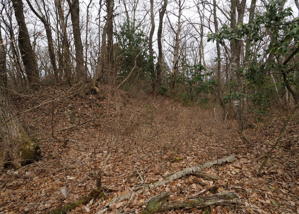 土塁頂部には切り込みのある場所が数か所認められますが、何を意図しているかは不明(写真7(B)など)。