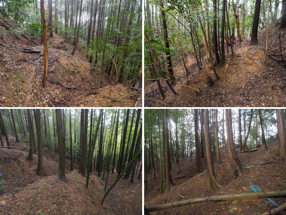 1期開削の堀切の中でも二の丸・三の丸間の堀切 cは北側が深く、掘り足しているように見えます(写真8)。堀切東縁の竪土塁(写真6・7)が畝状空堀群と連続していることから、堀切 c北側の再掘削は畝状空堀群と同時期(2期)に行われたと考えられます。このことは、一乗谷城 2期の北面重視、尾根上曲輪群「防塁」化を裏付けるものと考えます。