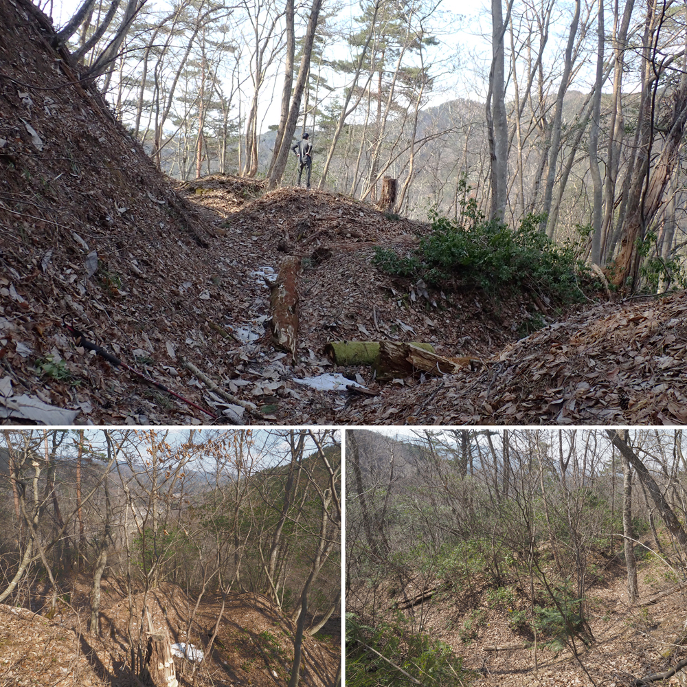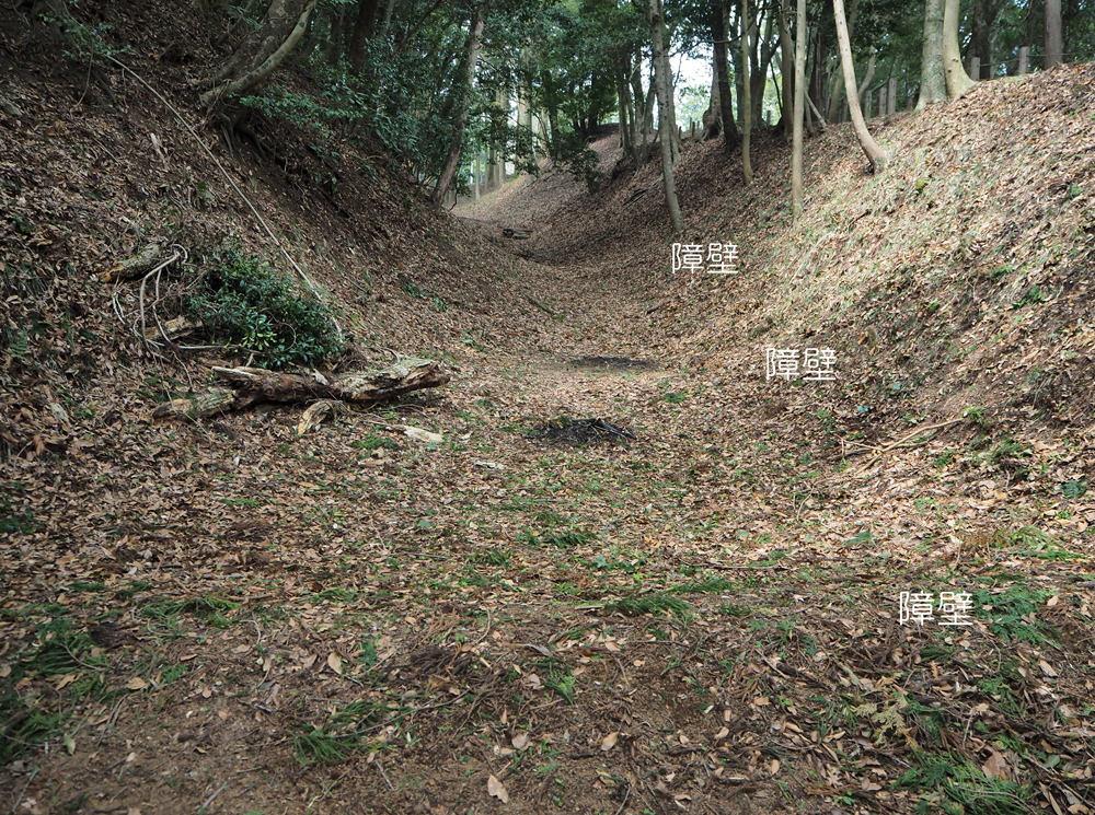 2期に開削された「尾根上曲輪群」北区の堀切 l(小文字L)は南側(城内側)に土橋を残しています。