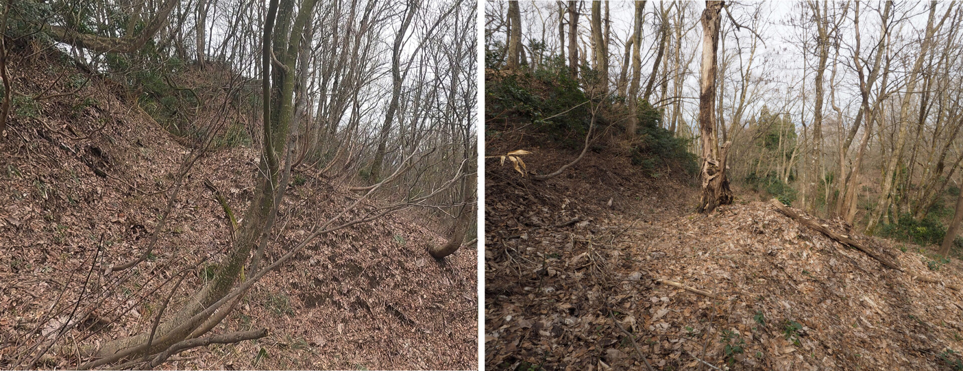 赤色立体図(図1・4)を見ると、曲輪群が周辺地形から分離され浮き出ています。これは、曲輪群の外周のほぼすべての面が人為的に削り出されていることによると考えられます。曲輪縁辺部のラインは直線的できれいに整っています(写真1)。三の丸南の断面もきれいな台形です。「尾根上曲輪群」の切岸面から畝状空堀群面は明らかに人為的で、自然地形ではありません。曲輪直下を削り出して角度のある切岸面を造り出し、切岸直下の緩斜面に畝状空堀群を築いています。