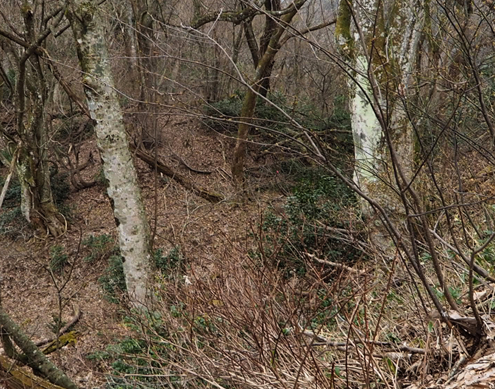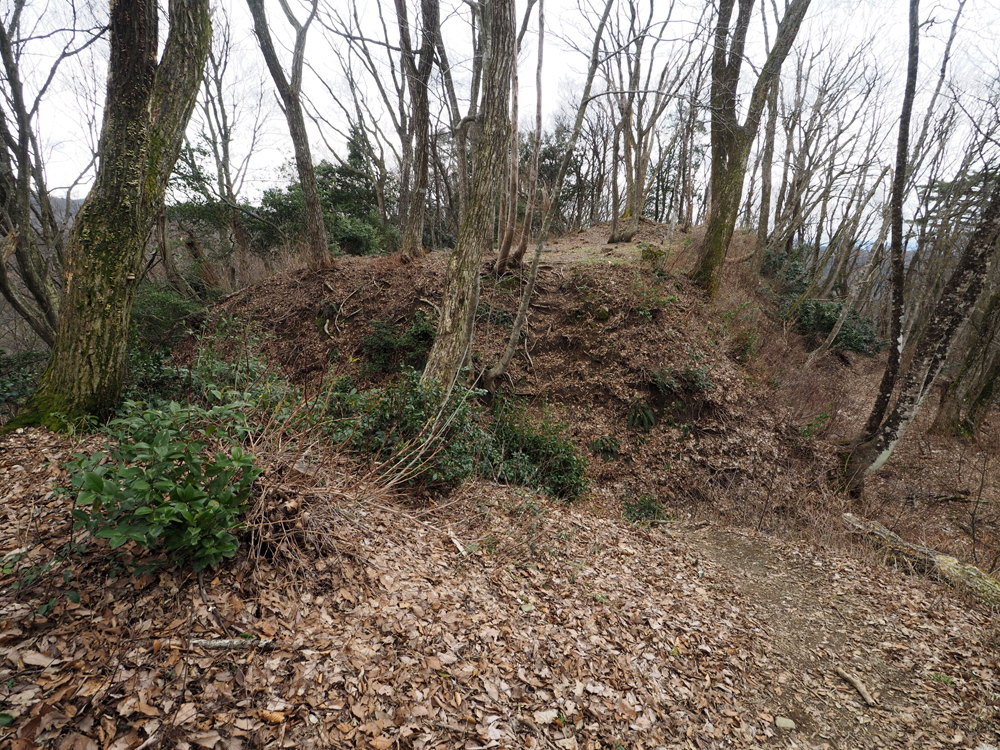 (写真4(C))は、左手が一の丸付属の堡塁で、右手が小規模な尾根を切断している堀切です。通路程度の堀切で、今回堀切番号は付けていません。
