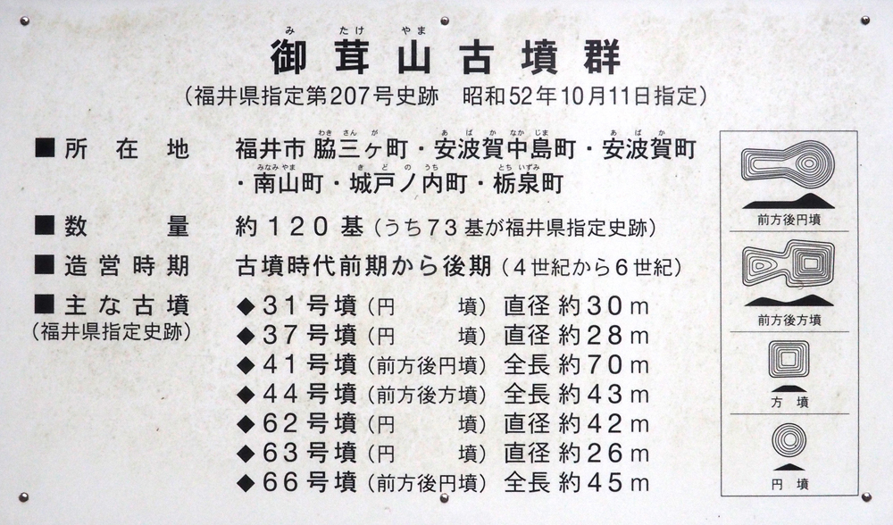 時代は、古墳時代前期から後期の各時期にわたるようです。福井市周辺では、前期に小規模な方墳を築くことが多いので、31号墳から下部の方墳群は古いかもしれません。