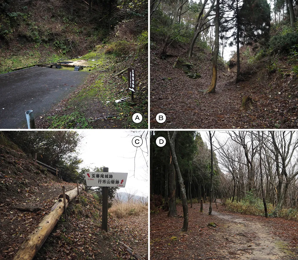 (A)曲輪Ⅲ(北馬出)から曲輪Ⅰ(主郭)側、(B)曲輪Ⅲ(北馬出)と堀切、(C)曲輪Ⅲ(北馬出)土橋。