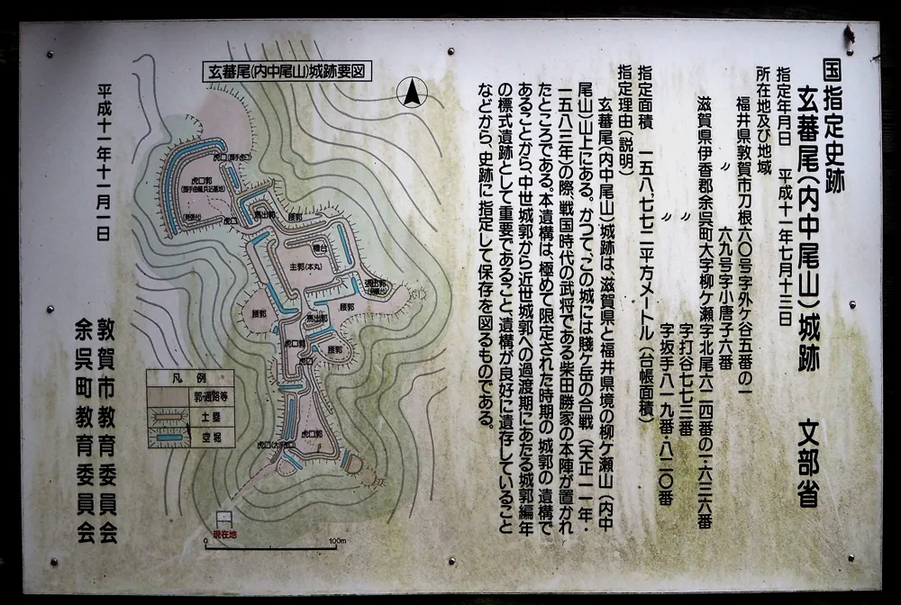 天正11年(1583年)に、羽柴秀吉と柴田勝家が天下の覇権を賭けて戦った賤ヶ岳合戦の陣城の一つで、柴田勝家の本陣となったのが玄蕃尾城です。当時は「内中尾城(内中尾山城)」と呼ばれていたようです。