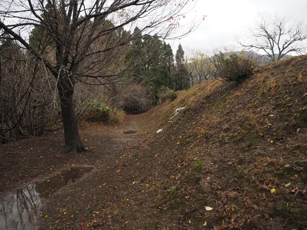 城外から見ると正面に堀切・土塁があり、そのやや左側面から右に折れて入るようになっています。