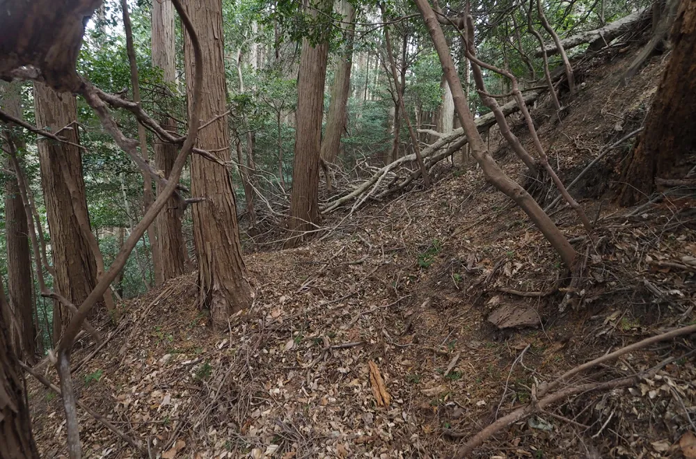 (写真1(A))は、主稜線東尾根の堀切です。尾根の鞍部にあります。