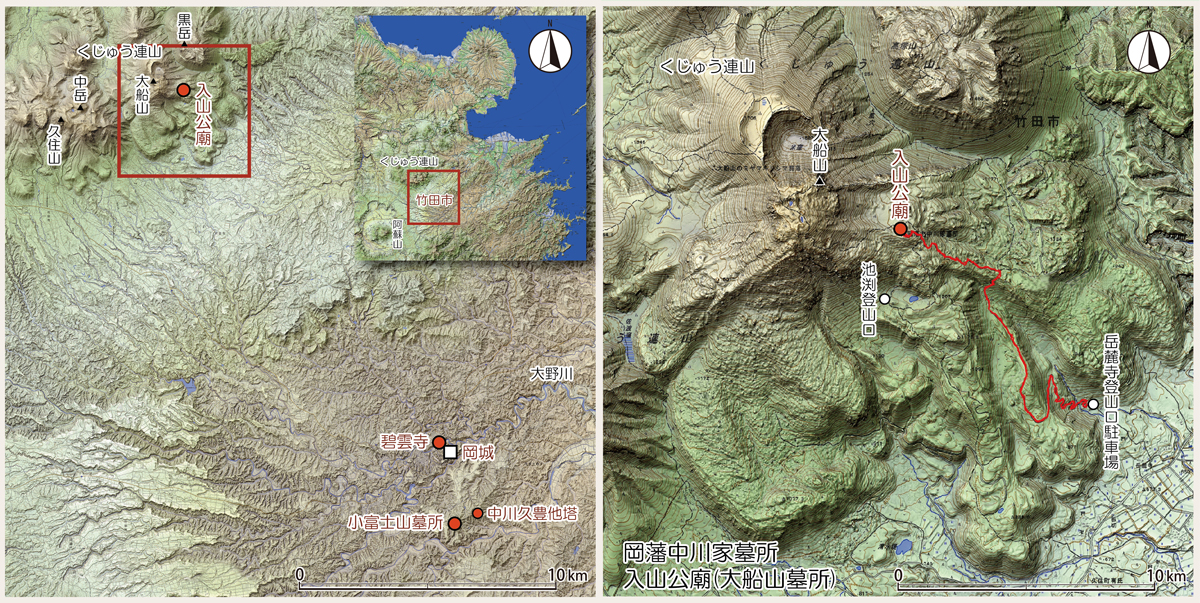 このうち、岡藩主中川家大船山墓所(入山公廟)は、九州本土最高峰の中岳(1791m)を中心とする くじゅう連山(九重山系)の東の盟主、大船山(たいせんさん)(1786m)の山中、標高1400m地点にあります(図1)。夏期は登山バスが池渕登山口まで走っていますが、私の行った4月は、岳麓寺登山口から標高差720m、登り1時間20分の歩きでした。もちろん途中に人家はありません。