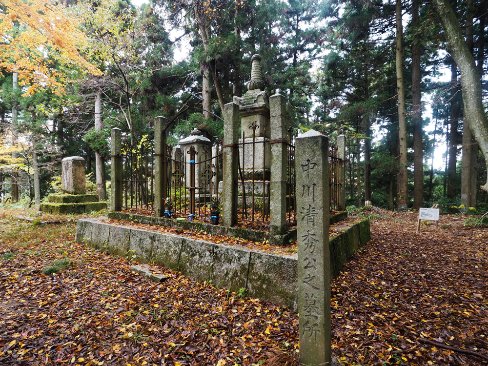 豊後岡藩中川家は、戦国時代の中川清秀を藩祖としますが、清秀は天正11年(1583年)に賤ヶ岳の戦いで柴田勝家方の佐久間盛政の急襲によって破れ自害します。墓所は賤ヶ岳の大岩山砦跡(滋賀県長浜市)にありますが、中川家では、4代藩主久恒が百回忌に新たな石塔を再建。宝暦12年(1762年)には8代藩主久貞が江戸からの帰路、賤ヶ岳古戦場にある藩祖清秀の墓所に参拝し、明和2年(1765年)には「追遠碑」を建立しています。