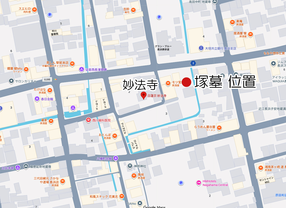 墓所は、滋賀県長浜市の妙法寺にあります。 妙法寺に菩提を弔うよう米30石を寄進したとの内容の秀吉の朱印状が残されているそうです。