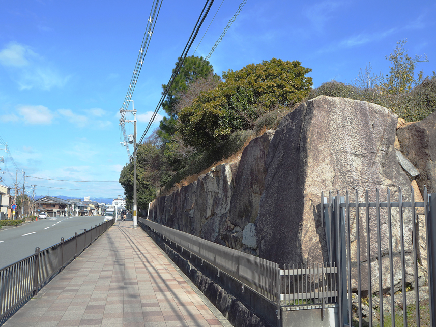 西山光照寺は、寺域境に巨石を用いた石垣を築いています。寺域北端隅には、「結界石」と推定される「南無阿弥陀仏」の六字名号が大きく刻まれた石碑があります。高さ2.3mです。六字名号の脇に「永禄三庚申十二月吉日」(1560年)とあることから、これが石垣の築造年代となる可能性が考えられています(福井県教育庁埋蔵文化財調査センター 2015年)。
